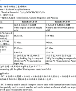椰子油酸羥乙基磺酸鈉(SCI)是一種以天然椰子油脂肪酸為原料的綠色環保型表面活性劑。PH值在5.0~7.0之間,與人體肌膚的酸鹼值接近,對肌膚刺激性低。SCI富脂性好,具有極佳的親膚性,不管在清洗過程或清洗後的觸感都不錯,洗後皮膚不會過於乾澀緊繃,具有柔嫩絲綢般的親膚感。SCI抗硬水能力強,發泡性及泡沫穩定性都極佳,易產生豐富、細緻且具彈性的泡沫。