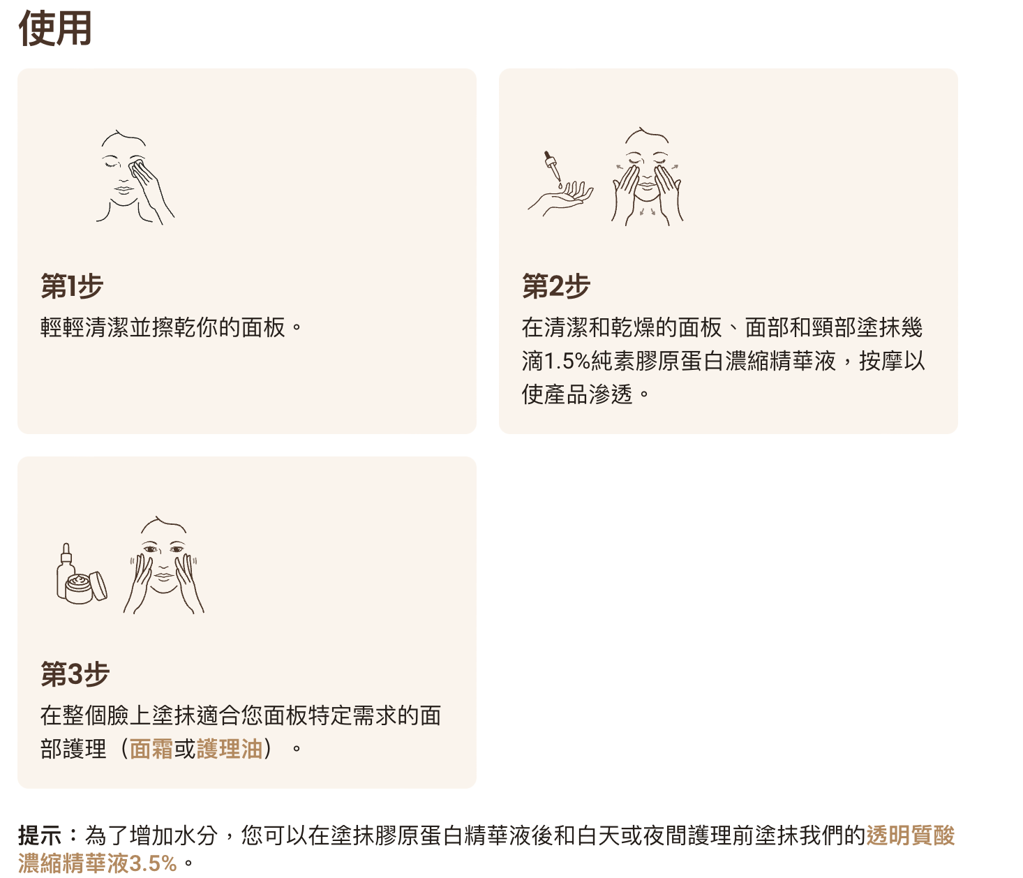配方中含有 1.5% 純素膠原蛋白,並搭配仿生複合配方,其組成概念靈感來自人體膠原蛋白結構,適合作為日常保養使用。
