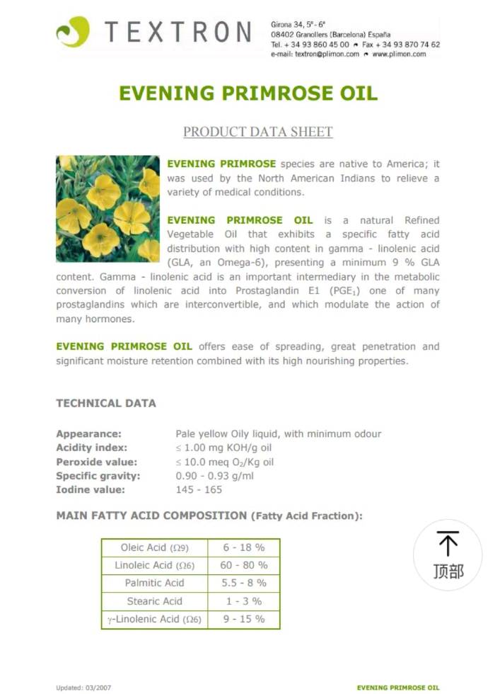 精製月見草油是一款天然的精製植物油,其脂肪酸分佈特殊,富含高濃度的 γ-次亞麻油酸(GLA,一種 Omega-6),GLA 含量至少為 9%。γ-次亞麻油酸是人體將亞麻油酸代謝轉換為前列腺素E1(PGE1)的重要中間產物。PGE1 是眾多前列腺素的其中一種,這些前列腺素可互相轉換,並負責調節多種荷爾蒙的作用。